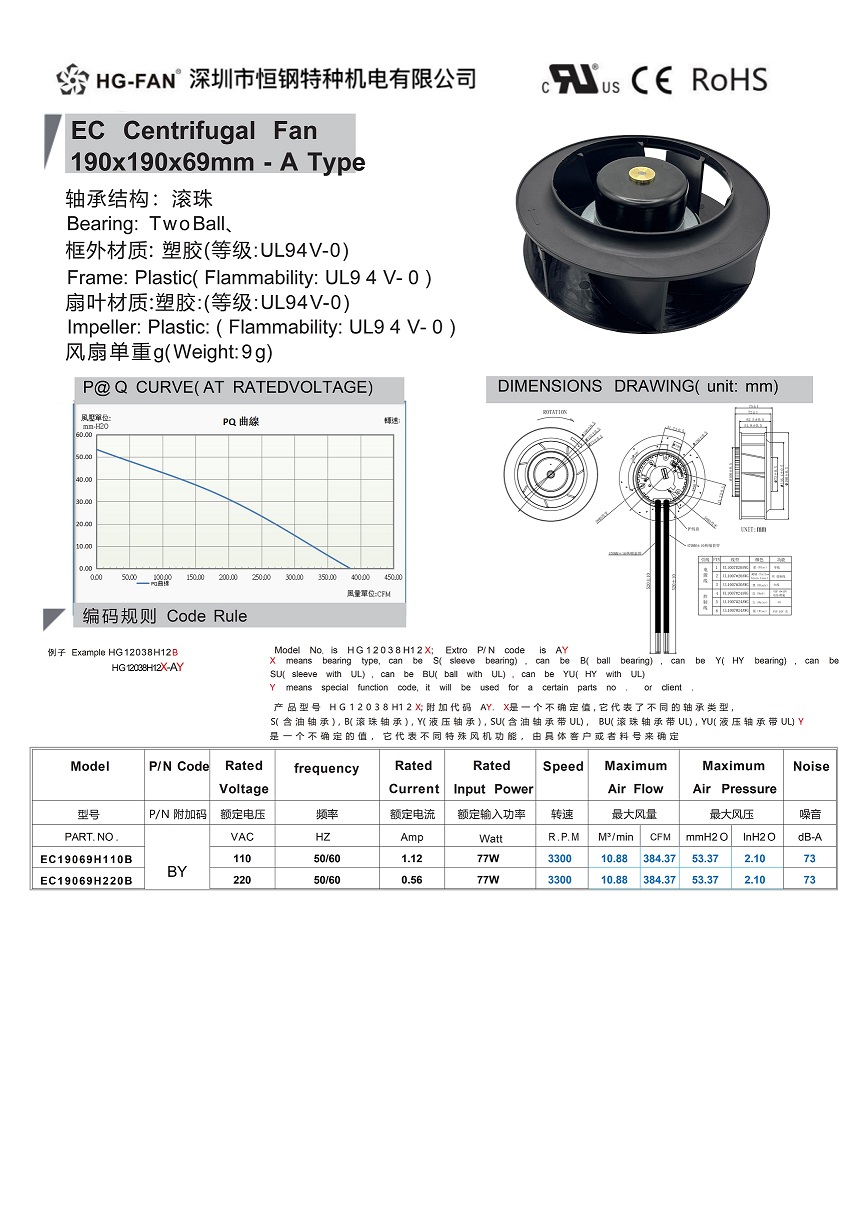 產(chǎn)品名稱:EC交流變頻離心風扇190X69MM